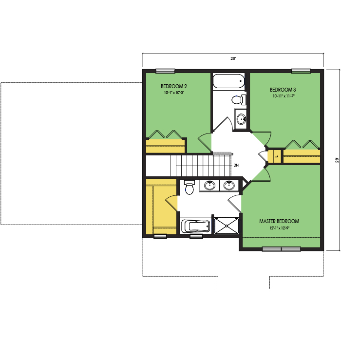 A part of our dream series, the tamarack floor plan features 3 bedrooms and 1.5 bathrooms with a foot print of 44x30 feet and 1342 total square feet of living space.