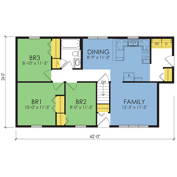 A part of our dream series, the tamarack floor plan features 3 bedrooms and 1.5 bathrooms with a foot print of 44x30 feet and 1342 total square feet of living space.