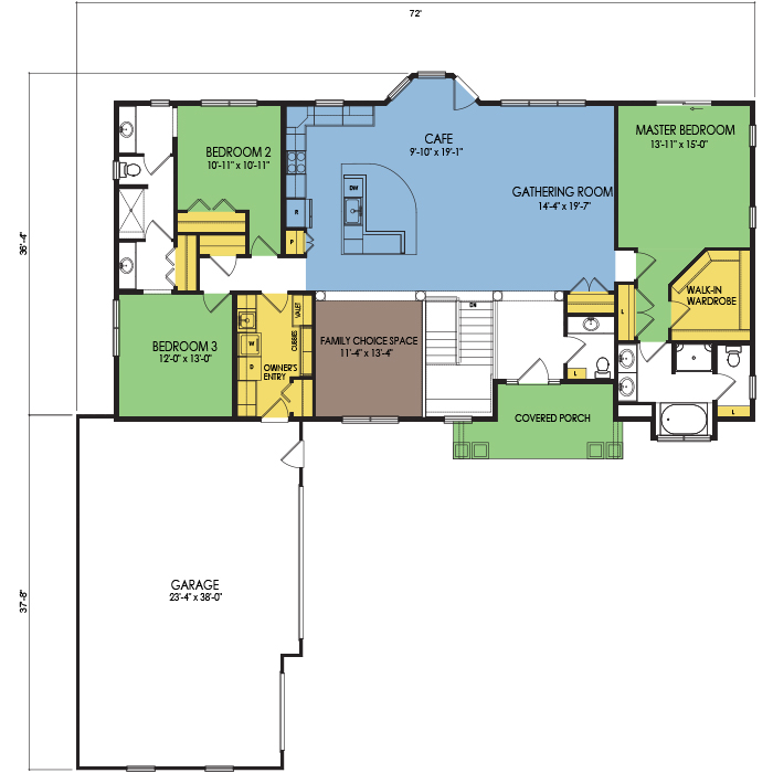 A part of our Vacation Series, the Poygan floor plan features 3 bedrooms and 2.5 bathrooms with a foot print of 72x74 feet and 2299 total square feet of living space. Floor Plan #VC159